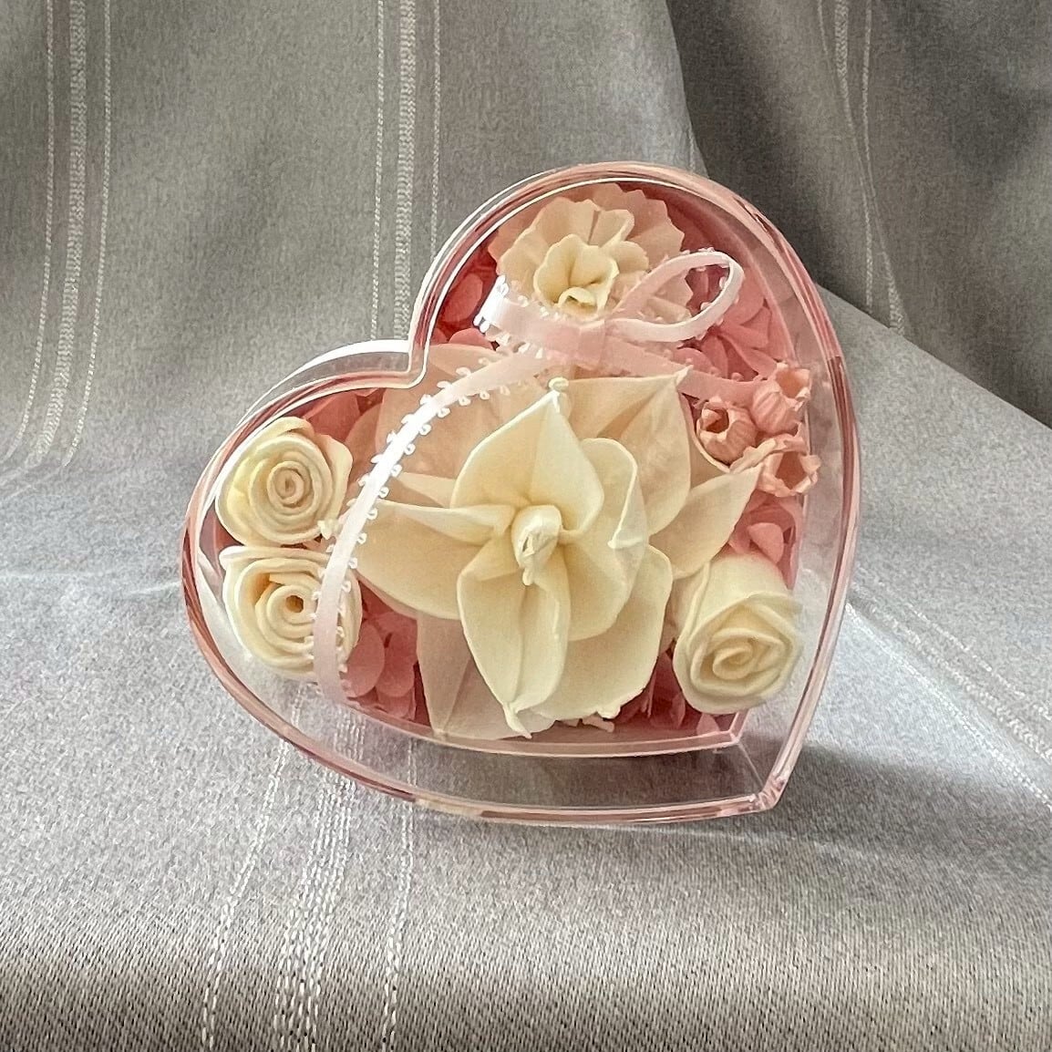 ハート型のクリアケースに、タイ伝統の自然素材「ソラ」から生まれたソラフラワーを贅沢にあしらいました。中央に配した存在感のある一輪と、繊細な花々が重なり合い、奥行きと華やかさを演出します。