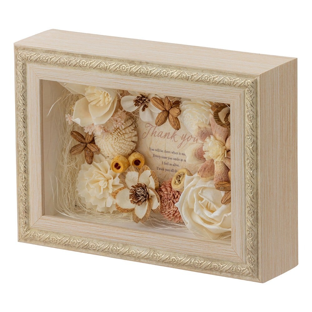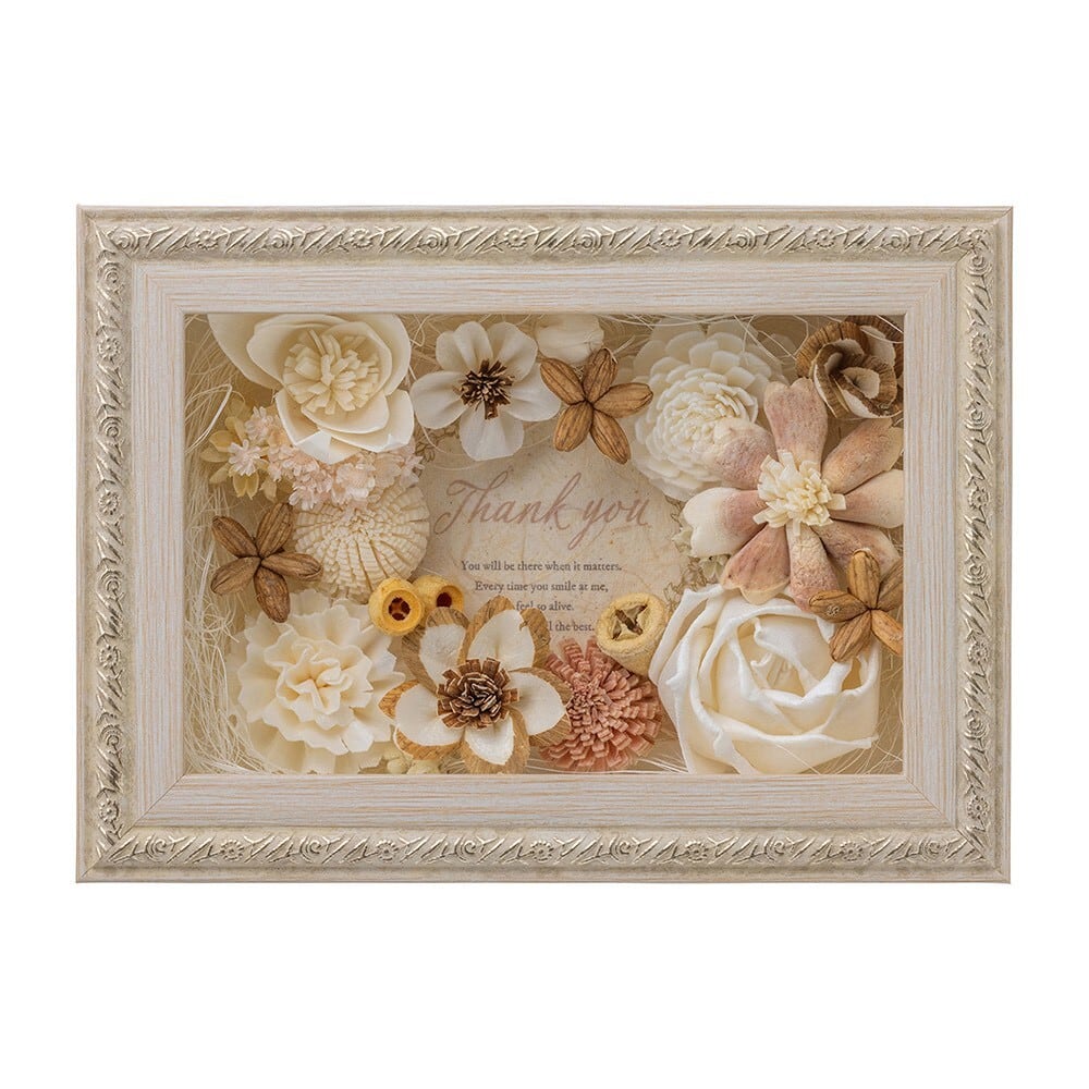 タイ伝統の自然素材「ソラ」から生まれたソラフラワーを、クラシカルな額に収めたウォールインテリアです。ベージュを基調とした落ち着いた色合いが、空間に温もりと安心感をもたらします。