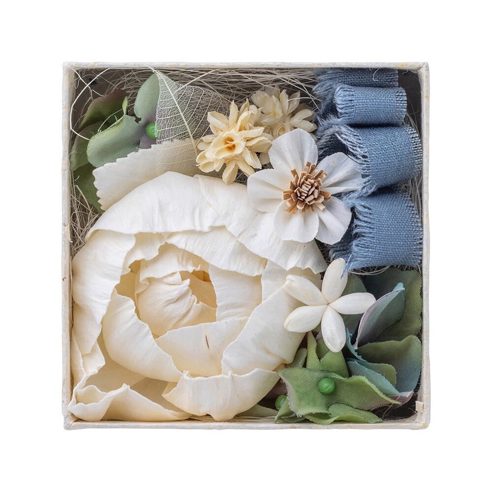 ソラフラワーの繊細な造形に、ブルーとグリーンを基調とした素材を組み合わせ、爽やかで洗練された印象にまとめました。自然素材ならではのやさしさがありながら、空間をすっきりと整える存在感があります。